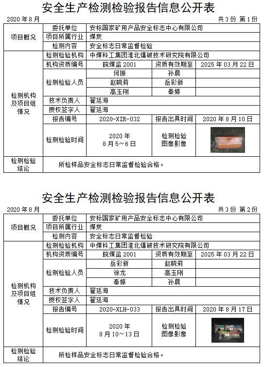 安全生产检测检验报告信息公开表(2020年8月)
