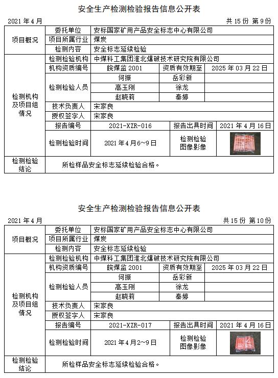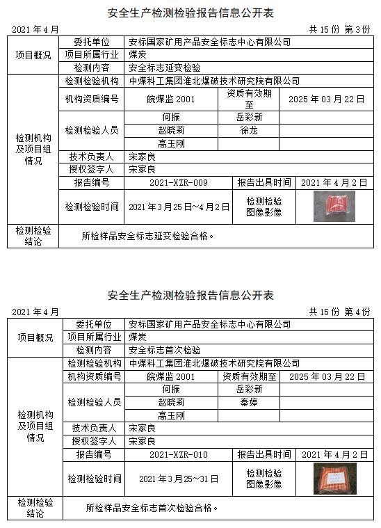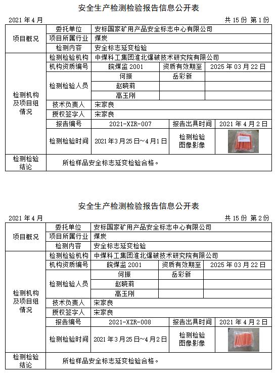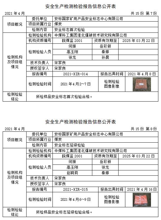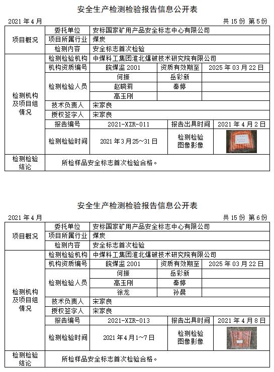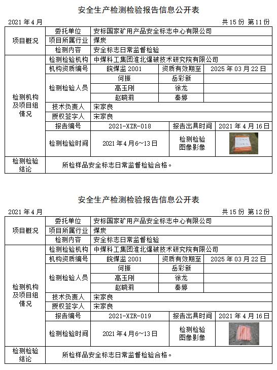 安全生产检测检验报告信息公开表(2021年4月)