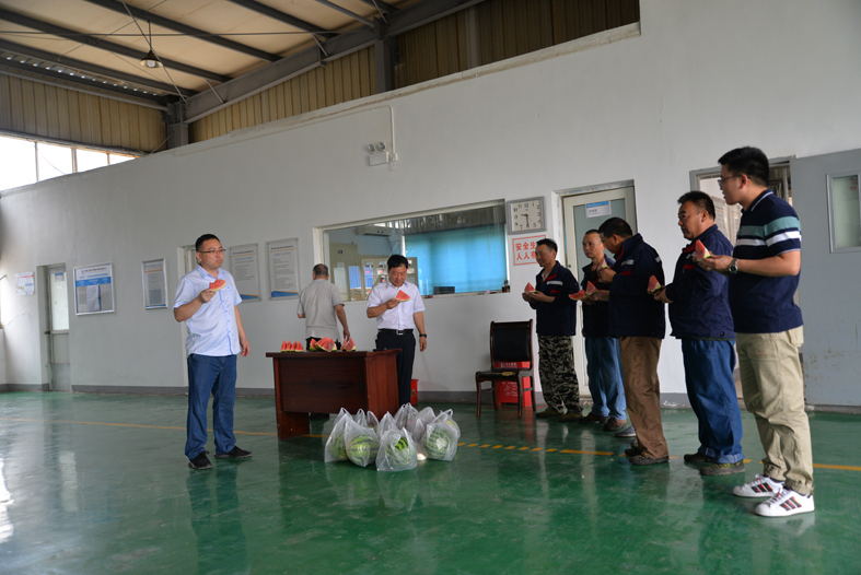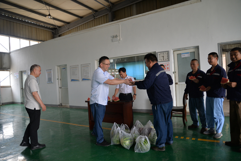 陈金华院长一行认真察看了生产车间,对仍然以高昂的工作热情坚守岗位的一线职工表示亲切的慰问,并将西瓜、饮料、毛巾和霍香正气液等防暑降温物品送到了一线职工的手中。
