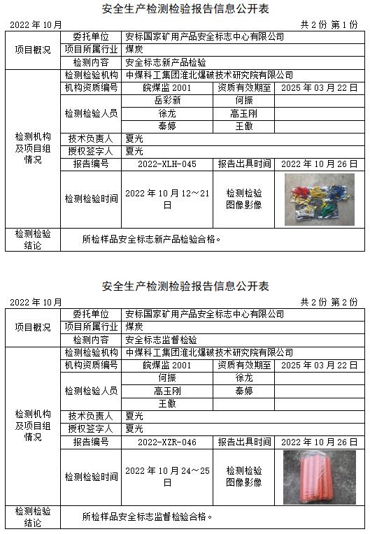 安全生产检测检验报告信息公开表(2022年10月)