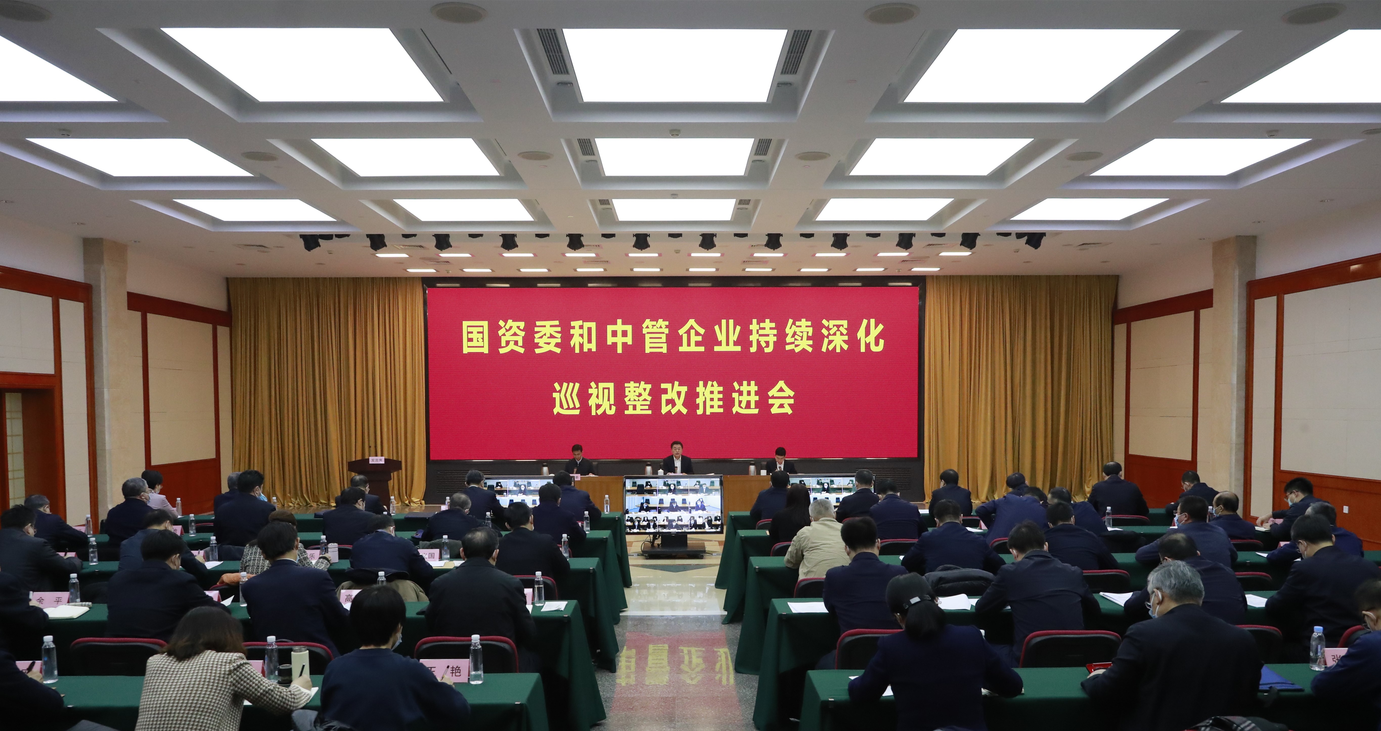 会议以视频会议形式召开,驻国资委纪检监察组、国资委各厅局、直属单位、直管协会有关负责同志在国资委主会场,各中管企业负责巡视整改的党组(党委)班子成员,纪检监察组(纪委)有关负责同志等在企业分会场参会。各委管企业党委副书记,纪委有关负责同志等在企业分会场列席。