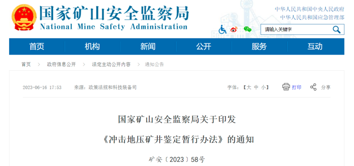 《冲击地压矿井鉴定暂行办法》已经国家矿山安全监察局2023年第14次局务会议审议通过,现印发给你们,请认真贯彻执行。