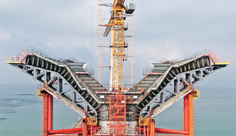 中央企业把主题教育与贯彻中央重大决策部署结合起来,切实抓好服务构建新发展格局战略任务。黄茅海跨海通道是继港珠澳大桥、深中通道之后,粤港澳大湾区又一跨海通道工程,由保利长大承建的黄茅海大桥中塔于2023年4月18日顺利封顶。图为4月17日,工人在黄茅海跨海通道黄茅海大桥进行墩柱基桩建设。 新华社记者 邓华/摄