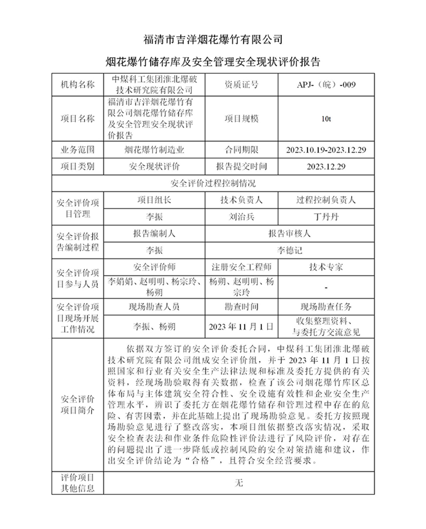 福清市吉洋烟花爆竹有限公司 烟花爆竹储存库及安全管理安全现状评价