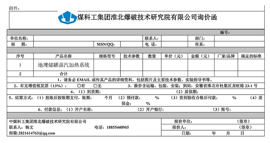 兹有565net必赢客户端科达分公司地埋储罐蒸汽加热系统采购项目需进行物资采购活动,现就储罐蒸汽加热系统采购进行公开询价采购,请意向报价单位通过响应报价函(附件)书面形式进行报价,感谢积极支持!